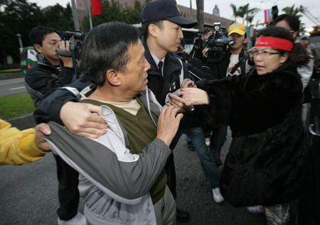 臺(tái)北中正紀(jì)念堂前的“大中至正”牌匾即將拆除,紅衫軍“自主公民協(xié)會(huì)”成員六日熬夜守護(hù)牌匾,抗議臺(tái)當(dāng)局拆除古跡。有路過(guò)的綠營(yíng)支持者罵三字經(jīng),引發(fā)沖突,隨即被警方帶走,避免紛爭(zhēng)!爸醒肷纭眻D 張皓安 攝