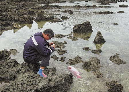 臺灣綠島暴斃的魚群原本只出現(xiàn)在燈塔到公館沿岸,六日連柚子湖一帶也出現(xiàn),到底是毒物擴散還是單純地被沖刷到此,引來當(dāng)?shù)鼐用窀叨汝P(guān)切,拍照存證。臺灣《中國時報》圖