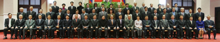 臺(tái)灣當(dāng)局“行政院”二十四日下午加開(kāi)臨時(shí)“院會(huì)”,通過(guò)總辭案。“行政院長(zhǎng)”張俊雄和全體成員拍“畢業(yè)照”留念。面對(duì)媒體關(guān)切和詢問(wèn),他不愿發(fā)表意見(jiàn)!爸醒肷纭眻D 蘇圣斌 攝