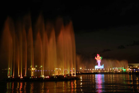 高雄燈會(huì)藝術(shù)節(jié)二日閉幕,閉幕前再表演水舞秀供民眾觀賞!爸醒肷纭眻D 陳朝福 攝