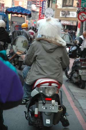 臺(tái)灣近來雖然天氣回暖,氣溫上升至二十余度,但臺(tái)北縣街頭,偶見摩托車手搞噱頭,在安全帽外面套上皮草(用動(dòng)物的皮毛所制成的服裝),引起過往行人側(cè)目!爸醒肷纭眻D 黃旭升 攝