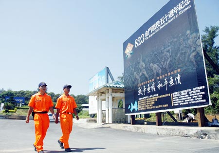 金門八二三炮戰(zhàn)五十周年即將到來,臺灣軍方和金門縣政府合辦系列紀(jì)念活動(dòng),并在“小三通”水頭港區(qū)布置巨幅看板,提醒“戰(zhàn)爭無情、和平無價(jià)”。圖:“中央社”