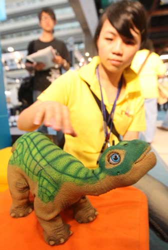 臺(tái)北國(guó)際機(jī)器人展八月二十一日在世貿(mào)展覽館開(kāi)幕,展出的恐龍電子寵物Pleo是全球唯一具有生命型態(tài),會(huì)打呵欠、 嘆氣、打呼、打噴嚏,有400種以上動(dòng)作的貼心寵物。(“中央社”圖)