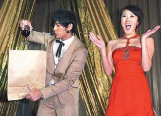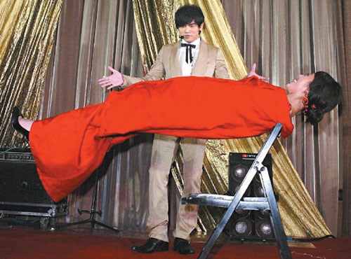 “南拳媽媽”團(tuán)長彈頭,昨天迎娶交往半年的女友洪端偋,晚間舉辦盛大豪華婚宴,介紹兩人認(rèn)識的周杰倫,婚禮上花心思帶來一段“超級魔術(shù)秀”,神奇地把新娘子漂浮空中。(臺灣《聯(lián)合報(bào)》圖)