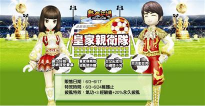 臺灣網游廠商也夠聰明,他們推出了應景的世界杯風格裝備產品。目前臺灣最熱血的武俠網游非華義旗下的“熱血江湖”莫屬。6月正值該游戲的改版升級階段,游戲服務商就順勢將6月打造成了“世足月”。其中最令球迷玩家興奮的就是,游戲地圖中將新增綠茵場為全新場景,游戲裝備也同步推出新款披風“皇家親衛(wèi)隊”。這款披風除了可以幫助玩家增加經驗值、氣功攻擊力之外,還能讓玩家為自己喜愛的球隊加油打氣,在游戲中體驗拉拉隊的歡樂氛圍。(導報記者 燕子 綜述)