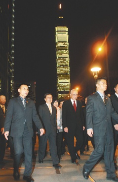 韓正于當(dāng)日晚間還登上世界第二高樓臺北101大廈,其間更巧遇101大廈燈全亮,韓正贊“臺北夜景漂亮”。