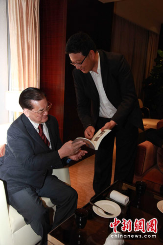 中新網(wǎng)杭州5月2日電 (記者嚴(yán)格)正在杭州參訪的中國國民黨榮譽(yù)主席連戰(zhàn)5月2日晚在其下榻的賓館會見了中新社浙江分社社長王旻及多次采訪連戰(zhàn)的分社記者,并接受了由中新社浙江分社與浙江省臺辦共同編撰的《浙臺口述歷史》一書。