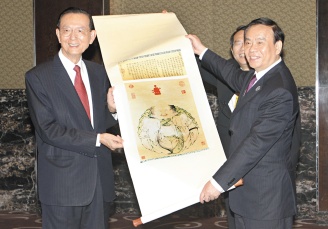 中新網(wǎng)6月12日電 據(jù)臺(tái)灣《聯(lián)合報(bào)》報(bào)道,浙江省長(zhǎng)呂祖善率領(lǐng)的浙江省代表團(tuán)十一日到新竹科學(xué)園區(qū)、工研院、臺(tái)積電參訪,中午與晚間分與臺(tái)灣呂氏宗親及中部三縣市長(zhǎng)、“立委”們餐敘!傲⑽眳螌W(xué)樟以世界呂氏宗親會(huì)理事長(zhǎng)身份款待呂祖善一行,呂祖善回贈(zèng)“呂祖謙全集”共十六冊(cè),他說(shuō)從未遇過(guò)這么盛大的懇親會(huì)場(chǎng)面,非常溫馨。