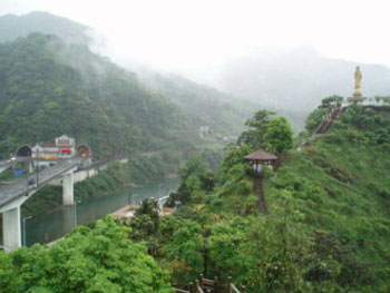 大約10分鐘,就爬上了觀(guān)音臺(tái)。觀(guān)音臺(tái)立有一座四十尺高,以青銅鑄造的觀(guān)音圣像,下方另一平臺(tái),有一圓頂?shù)牡钐,祀奉觀(guān)音神像。觀(guān)音臺(tái)上,居高臨下,眺望遠(yuǎn)近山水,俯瞰坪林聚落,景色怡人。觀(guān)音臺(tái)步道沿途亦無(wú)遮蔭,陰涼天氣或雨中來(lái)訪(fǎng)皆宜,惟不宜艷陽(yáng)高照日。