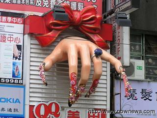 中新網(wǎng)6月23日電 據(jù)臺灣“今日新聞”報道,桃園市某家美甲業(yè)者招牌頗具創(chuàng)意,一只巨大的左手正高高掛在店門之上,還特別做個蝴蝶結(jié),宛如天上掉下來的禮物,每當民眾經(jīng)過此店,總是會留意一下如同仙女般的左手。
