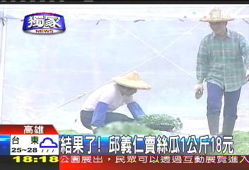 中新網(wǎng)7月20日電 據(jù)臺(tái)灣TVBS報(bào)道,臺(tái)當(dāng)局前“國安會(huì)秘書長(zhǎng)”邱義仁5月初南下高雄務(wù)農(nóng),經(jīng)過2個(gè)多月,他種的絲瓜現(xiàn)在已經(jīng)結(jié)實(shí)累累,3天前邱義仁開始采收,10多箱的絲瓜經(jīng)由產(chǎn)銷班賣到臺(tái)北,1公斤的價(jià)格大概新臺(tái)幣18元,邱義仁的好友戴振耀說,受到臺(tái)風(fēng)影響,價(jià)格不算好,不過總算是邱義仁當(dāng)農(nóng)夫交出的第一張成績(jī)單。
