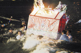到了午夜,各宗親會人員移師到望海巷海岸。道長主持祭拜儀式后,各宗親會點燃水燈頭的銀紙,再將水燈頭推向海面。水燈頭在暗夜中散發(fā)火光,在海面漂流,讓陰間好兄弟感受到暖意。