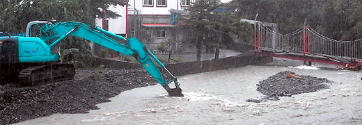 災(zāi)情最嚴(yán)重的是冬山鄉(xiāng)的太和村,上游的十三份溪在上次芭瑪臺(tái)風(fēng)來襲時(shí),溪里大量土石淤積,還來不及全部清除,這次又逢大雨,溪水暴漲淹到路面,多條農(nóng)路封閉。縣府工務(wù)處緊急出動(dòng)3臺(tái)挖土機(jī)疏浚十三份溪,避免溪水的水位持續(xù)升高,造成更嚴(yán)重的災(zāi)情。