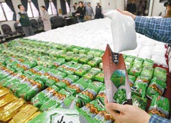 調(diào)查人員見狀立即上前將人、車扣留,并上船搜索,隨即在漁船前艙發(fā)現(xiàn)一密室,打開發(fā)現(xiàn)成堆K他命,分裝在茶葉、食品、飼料等不同產(chǎn)品袋子中,企圖魚目混珠。經(jīng)清查后共有K他命成品八百四十七公斤,估計(jì)黑市價(jià)格高達(dá)十億元,是島內(nèi)最大宗K他命走私案。