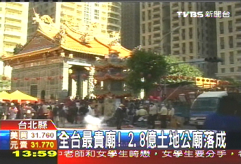 中新網(wǎng)1月19日電 據(jù)臺(tái)灣TVBS報(bào)道,臺(tái)北縣的深丘福德宮,因?yàn)樯w在黃金地段的新板特區(qū),以2年前一平米200萬(新臺(tái)幣 下同)的地價(jià)計(jì)算,這間土地公廟地價(jià)已經(jīng)高達(dá)2.8億,號(hào)稱是全臺(tái)最貴的廟。之前因?yàn)椴少彿ㄟt遲無法完工,最近終于蓋好了,上午舉行安座大典,神明搬新家,場面相當(dāng)熱鬧。