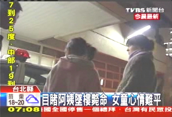 下午6點(diǎn)多,女童和林姓女子出門回家,發(fā)現(xiàn)忘了帶鑰匙,林姓女子打開(kāi)樓梯間的窗戶,想爬到家里陽(yáng)臺(tái),但卻失足從4樓高摔下,頭先撞到雨棚再掉到1樓,當(dāng)場(chǎng)斃命;小女童目擊一切,小小心靈受傷,恐怕一時(shí)半刻難以平復(fù)。