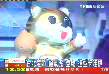 中新網(wǎng)2月1日電 據(jù)臺(tái)灣TVBS報(bào)道,2010年臺(tái)北燈節(jié)主燈座1日亮相,一座長相渾圓可愛的福氣虎,取名為“Hoki”(閩南語:福氣),這只福氣虎有20米高,旁邊還圍繞著5位花精靈,整個(gè)組合不僅色彩十分豐富,還會(huì)搭配雷射光和水舞秀,甚至還會(huì)釋放花香,讓民眾在賞燈時(shí),有豐富的感官享受。