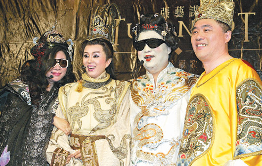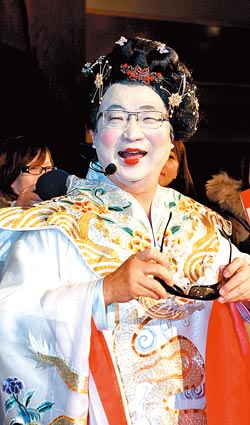胡志強(qiáng)犧牲“色相”,涂上脂粉、抹成櫻桃小嘴,身著華麗戲服,花一個多小時化妝,才順利變成反串成主角圖蘭朵公主,現(xiàn)場卻有人說“不像公主,比較像藝妓”。郝龍斌則是黃袍加身,扮成皇帝,成了圖蘭朵的父親。陳文茜身著戲服、戴著墨鏡,飾演圖蘭朵的妹妹。孫翠鳳則扮成王子卡拉富,四人妙語如珠,引起哄堂大笑。