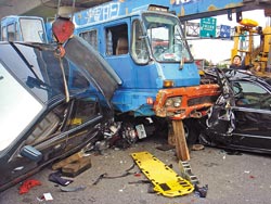 中新網(wǎng)4月17日電 據(jù)臺灣《中國時報》報道,臺灣男子呂昭明十六日傍晚駕駛二十噸吊車,疑因剎車失靈,連續(xù)追撞十一輛汽車及摩托車,導(dǎo)致騎摩托車的母親蔡阿櫻重傷、讀高中的女兒陳亭婷與初中的兒子陳柏翰當(dāng)場死亡,另有五人輕傷,車禍現(xiàn)場怵目驚心。