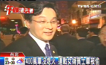 中新網(wǎng)5月1日電 據(jù)臺(tái)灣TVBS報(bào)道,國(guó)民黨榮譽(yù)主席連戰(zhàn)的女婿、連惠心丈夫陳弘元的奔馳車被偷,消息也登上新聞版面。陳弘元是和妹妹到新竹拜訪易經(jīng)老師,司機(jī)趁空檔,到超商繳費(fèi)而沒熄火的時(shí)候,原價(jià)400多萬的奔馳車,被歹徒乘機(jī)偷開走。