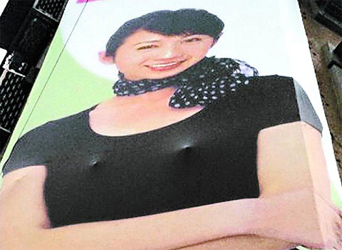 中新網(wǎng)5月19日電 據(jù)臺(tái)灣《蘋(píng)果日?qǐng)?bào)》報(bào)道,臺(tái)北市信義路、松仁路口的臺(tái)北市議員許淑華競(jìng)選廣告帆布廣告牌,于20多天前設(shè)立,因當(dāng)時(shí)晚上施工的人員未拆下帆布后方凸出鐵條,導(dǎo)致廣告上胸部位置有兩點(diǎn)凸起,造成“激凸”效果。