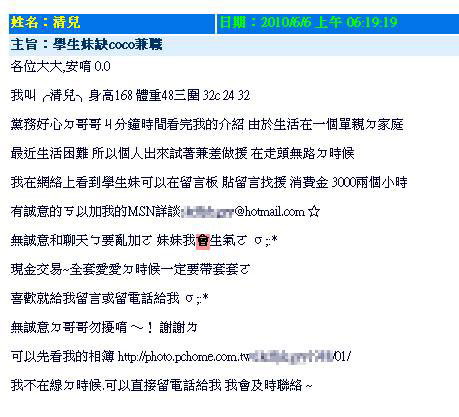 據(jù)報道,來到高雄縣教師會網(wǎng)頁,點進留言板流覽,為人師表的空間怎么會有一則“援交”廣告?廣告上頭不但自稱是大二學(xué)生,還“男女不限”,因為缺錢,希望大家“援助”。