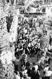 興濟(jì)宮還專設(shè)“宴王”,給予圣駕最高禮遇。數(shù)十平方米的大桌上有大龍蝦、烤乳豬等過(guò)百道各色食品。當(dāng)?shù)貙W(xué)生葉升融說(shuō)起桌子正中最醒目的“山珍海味”,如數(shù)家珍,“用姜堆成的是‘山’,下面鋪著的紅豆綠豆代表了‘珍’,雪白的鹽就是‘!,‘味’則用紅糖表示!彼麑(duì)著“宴王”不斷按動(dòng)快門(mén),說(shuō)晚上就把照片傳到部落格上,和朋友們一起分享。 (記者 鄭璜 通訊員 林廣明)