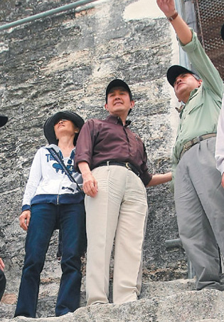 原來,馬英九陪同周美青爬上馬雅四號(hào)神殿,馬英九贊嘆建筑之美,甚至向媒體解釋“神殿石塊如何黏著”時(shí),一旁的“酷酷嫂”突然竄出,拍著馬英九肩膀笑稱“三秒膠?”讓馬英九頓時(shí)語塞,不知如何接話。