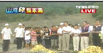 而馬英九到了遭土石掩埋的新開部落,也在當(dāng)?shù)胤傧慵腊萃稣,神情凝重;在進(jìn)入新開部落前,會經(jīng)過日前災(zāi)民立牌寫著“32人死亡,SOS”的新寶橋,因為橋斷了,施工單位先在河床鋪上便道,讓車子可以通過。
