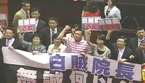 據(jù)臺(tái)灣TVBS報(bào)道,吳敦義還沒(méi)上臺(tái),事前保密到家的民進(jìn)黨“立委”們,突然拿著白布條、標(biāo)語(yǔ)霸占主席臺(tái),大喊“白賊義,道歉”,稱吳敦義香港行的說(shuō)法一變?cè)僮,有誠(chéng)信問(wèn)題。吳敦義則留在原位,國(guó)民黨人上前安撫,也做護(hù)駕動(dòng)作,避免與民進(jìn)黨“立委”發(fā)生肢體沖突。