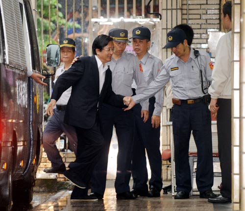 陳水扁在10月9日凌晨重回臺北看守所之后,今天是第一次二審準(zhǔn)備程序庭,由于臺北下著大雨,導(dǎo)致陳水扁到高院時有些遲到,約9點才抵達(dá)高院候?qū)徥。警備車停靠較接近候?qū)徥,原本法警?zhǔn)備雨傘,但陳水扁一個箭步就從車上跳下,直接走進(jìn)候?qū)徥,陳水扁面帶微笑,感覺精神不錯。