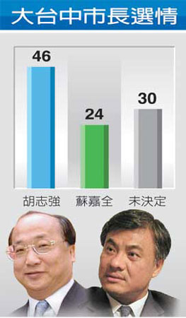 中新網6月4日電 據臺灣《聯合報》報道,臺中市接連發(fā)生重大治安和警紀案件,《聯合報》對大臺中市長最新選情調查發(fā)現,胡志強目前雖以46%支持率領先蘇嘉全22%。