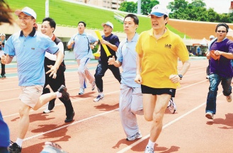 據(jù)悉,中國國民黨青工總會20日在高雄縣立體育場舉行運動嘉年華會,馬英九以黨主席身份與會,喜愛運動的他表示,養(yǎng)成運動習慣只須克服一個“懶”字。接著,馬英九帶頭跑運動場一周400米,為鼓勵大家快跑,只要在兩分鐘內(nèi)跑完400米,就有2000元獎金。