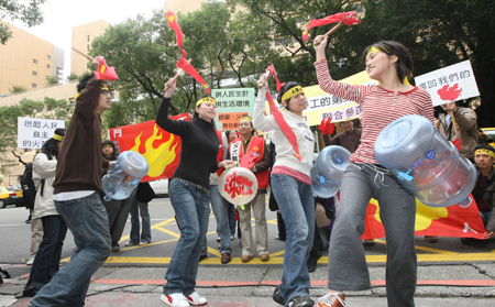 中新網(wǎng)11月20日電 據(jù)“中央社”報(bào)道,今天是臺(tái)灣地區(qū)“立委”候選人申請(qǐng)登記的截止日,綠黨與人民火大聯(lián)盟前往“中選會(huì)”登記不分區(qū)“立委”,在門(mén)前載歌載舞,敲打著水桶高喊“拼人民生計(jì)、拼生活環(huán)境”,諷刺當(dāng)局治理無(wú)能。