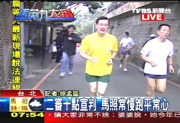 據(jù)臺灣TVBS報道,馬英九穿著一件黃色輕便的運動服,同往常一樣在六點四十分就從家門出發(fā)要去慢跑。記者問他對二審的判決有沒有信心,馬英九說,慢跑的時候他暫時不想回答這個問題。