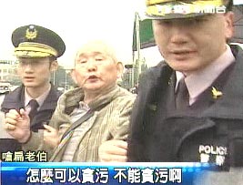陳水扁在會上依舊鼓吹推動“入聯(lián)公投”,但沒想到臺下卻有民眾嗆扁,嗆扁民眾隨即被警察帶走;但又有民眾高喊:“阿扁下臺!”嗆扁老伯念念有詞:“怎么可以貪污,不能貪污!”老伯隨后同樣也被架走。(高大林)