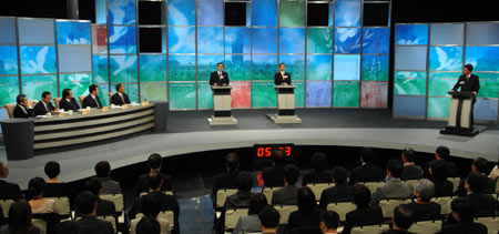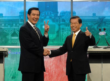 圖為馬英九與謝長(zhǎng)廷第二場(chǎng)電視辯論會(huì)場(chǎng)情形。(圖:“中央社”)
