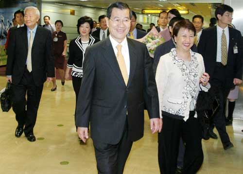 蕭萬長率領(lǐng)“兩岸共同市場基金會”代表團一行是在十一日上午搭機經(jīng)由香港前往海南,同行的有淡江大學(xué)教授蘇起、臺積電董事長張忠謀夫婦、華新麗華董事長焦佑倫和臺灣水泥董事長辜成允等人。