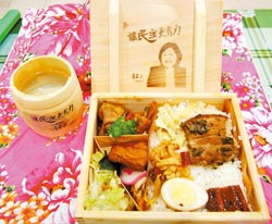民進(jìn)黨主席蔡英文(左)吃著印有自己肖像的便當(dāng)時(shí),忍不住欣喜滿足,一旁的嘉義縣長陳明文也津津有味地品嘗。
