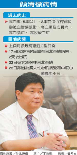 據(jù)臺灣《聯(lián)合報》報道,外界質(zhì)疑顏清標(biāo)裝病逃避入監(jiān),其主治醫(yī)師周嘉裕表示,顏清標(biāo)的心臟明顯擴大,有嚴重肺積水等病癥。他反問:“像肺水腫這種,怎么假裝?”