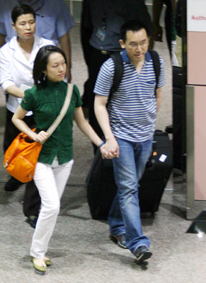 陳致中夫婦25日清晨5時(shí)左右搭機(jī)返臺,兩人手牽手步出海關(guān)。“中央社”圖