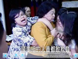 “項目報告啦,項目報告嘛”,“先讓她念完再報告嘛!”藍(lán)綠雙方拉扯成一團(tuán)。會議主席在上面大喊,連議事組的人員都敢欺負(fù)。