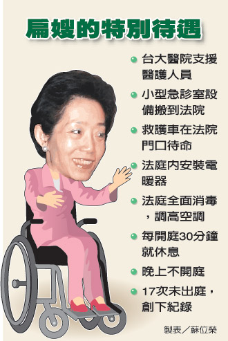 除了基本的醫(yī)療戒護(hù),臺(tái)北地院擔(dān)心長(zhǎng)時(shí)間開(kāi)庭,虛弱的吳淑珍會(huì)撐不住,每開(kāi)庭30分鐘就休庭10分鐘,庭訊預(yù)計(jì)3小時(shí),而且晚上不開(kāi)庭,甚至在律師進(jìn)行答辯時(shí),吳淑珍還可以到一旁的第八法庭稍作休息。這樣的高規(guī)格對(duì)吳淑珍,就是要讓審理過(guò)程更加順利。