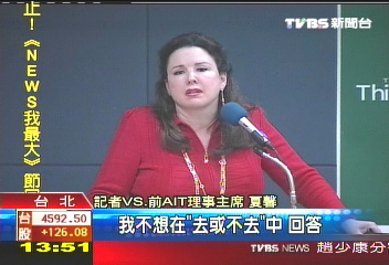 中新網(wǎng)2月13日電 據(jù)臺(tái)灣“今日新聞”報(bào)道,曾經(jīng)被陳水扁贊譽(yù)為“臺(tái)灣守護(hù)天使”的前美國在臺(tái)協(xié)會(huì)(AIT)理事主席夏馨,一向挺扁到底,但今天(13日)夏馨應(yīng)邀來臺(tái)演講,卻一反常態(tài),不但只字不提政治,當(dāng)媒體一問到“陳水扁”三個(gè)字,夏馨竟然當(dāng)場變臉!