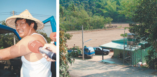 臺灣南部此時太陽正烈,邱義仁頂著艷陽在兩千多坪農(nóng)地上來回巡,整地工人開著挖土機整地,他蹲在田里,拿著磚頭、鏟子松土,戴振耀不時湊過去“指導”,教他怎么把土翻松。