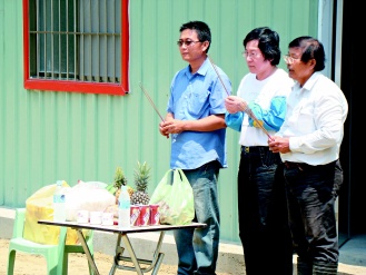 戴振耀陪邱義仁焚香拜拜,祈求風調(diào)雨順年年收成好;他說,前晚兩人聊種田的事聊到12點多,邱義仁對務農(nóng)很有興趣。