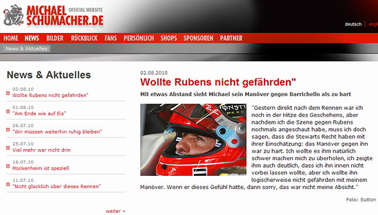 舒馬赫在官網(wǎng)上稱:“再次看過我與魯本斯之間的錄像后,我覺得干事的處罰是正確的。那種強(qiáng)硬的防守確實(shí)太過分了。我沒有發(fā)覺我的動作帶給他的危險。如果他這么覺得,那么我要說:對不起,我不是故意的。”