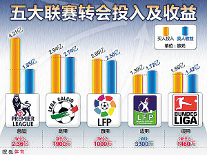 由于對于轉(zhuǎn)會費看法不一,各國媒體對于總體轉(zhuǎn)會費的統(tǒng)計存在差距,但目前比較可信的數(shù)據(jù)顯示,今夏轉(zhuǎn)會市場上,英超以4.21億歐元的投入雄踞榜首。《每日電訊報》援引了這個數(shù)據(jù),但資料同時顯示,英超轉(zhuǎn)會收入只有1.85億歐元。也就是說,英超凈投入達(dá)到2.36億歐元。但真正令人震驚的數(shù)據(jù)還在后面,英超大約2.6億英鎊的轉(zhuǎn)會費流到了歐洲大陸俱樂部的賬戶之中,本國聯(lián)賽之間的人才轉(zhuǎn)會費用不足一半,這個數(shù)字比去年同期增長了66%。