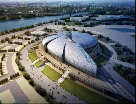 南沙體育館是亞運(yùn)會(huì)武術(shù)比賽場(chǎng)館,因此在設(shè)計(jì)上場(chǎng)館也體現(xiàn)了中國(guó)武術(shù)的意境。南沙體育館的外殼分九個(gè)曲面單元,單元間片片層疊,并分為南北兩組以比賽大廳圓心為中心呈螺旋放射狀展開(kāi)。這種富有動(dòng)感的設(shè)計(jì)隱喻了中國(guó)武術(shù)的最高境界——“陰陽(yáng)俱合,天人合一”。同時(shí)結(jié)合廣東海洋文化的特征,借鑒了富有肌理變化的“海螺”外殼作為造型設(shè)計(jì)的意向。南沙體育館主體鋼結(jié)構(gòu)部分采用了雙層環(huán)形張弦穹頂結(jié)構(gòu),主跨度達(dá)到了98米。