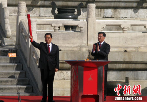 隨后,廣東省委書記汪洋從火種衛(wèi)士手中接過引火棒,點燃祈年殿前的火種盆。中共中央總書記、國家主席胡錦濤在火種盆中點燃了主火炬,亞運北京首棒火炬手張琳從胡錦濤手中接過了火炬“潮流”。